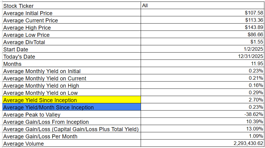 BBCP had total dividends of $1.0000 from 1/2/2025 to 12/31/2025. During that time frame it had a starting price of $6.63, a high price of $9.68, a low price of $4.78, and a 12/31/2025 price of $6.71. This means that it had a yield of 15.08%, or an average monthly yield of 1.26%. The peak-to-valley is -50.62%.* The capital gains were 1.21%. The overall gain/loss (cap gains + yield) is 16.29%, or a gain/loss per month of 1.36%. The average volume since inception was 130,247.