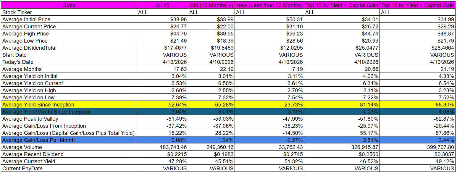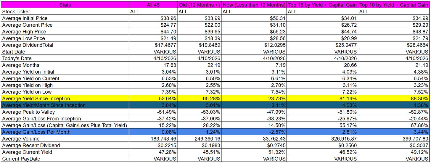 First, an averages table for all YieldMax products covered in this post. The columns in the table below from left-to-right are: