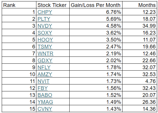 Figures in the Top 15 list are yield + capital gain normalized by months in existence