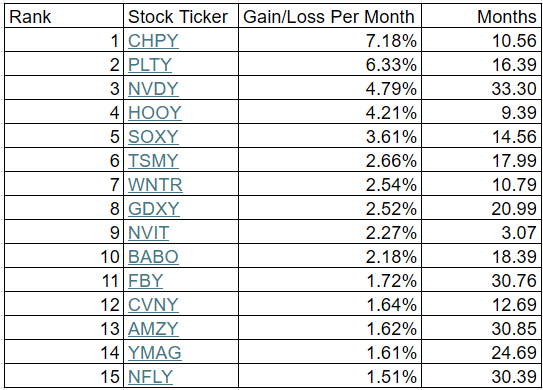 Second, a Top 15 list by yield + capital gain normalized by months in existence